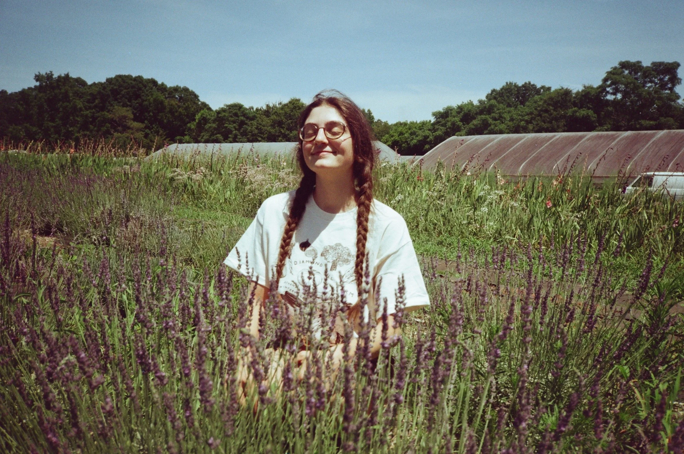 Farmer Carolyn in the lavender field modeling the new farm tees she designed (available at all of our markets!!)