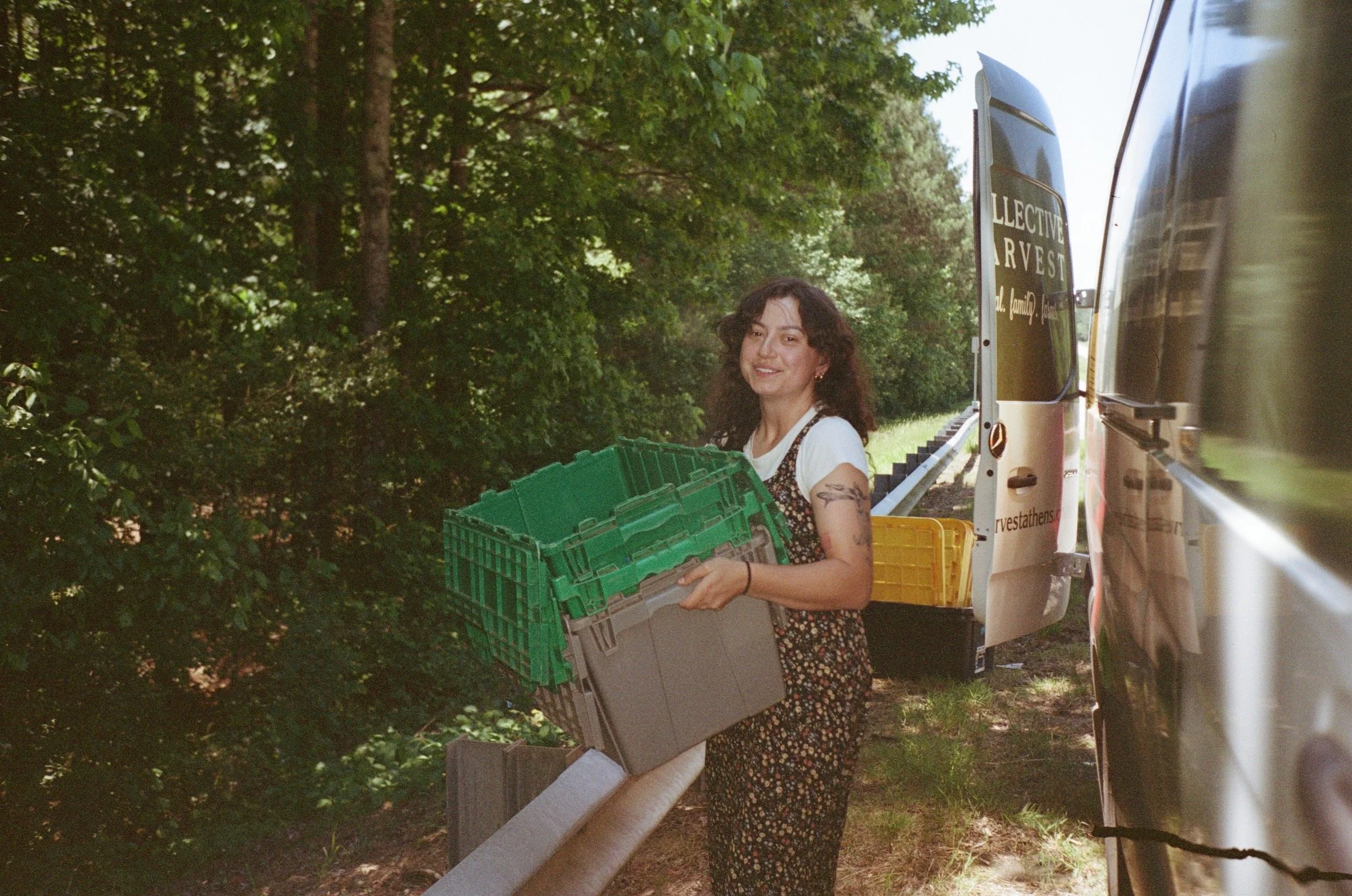 Farmer Bekah moves bins to the “rescue van” on the side of the highway after her market van blew a tire