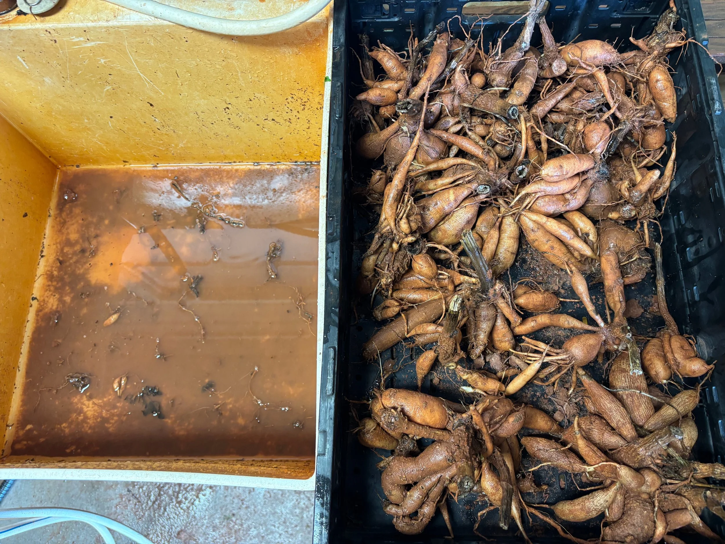 In flower land we also had a big week prepping for — believe it or not — fall blooms! If you remember, not too long ago we dug up all of our dahlia tubers - our annual chore to protect them from the winter freezes and divide them to plant again the following season. After some weeks in the cooler, it was finally time to get our snips and knives out, get dividing, and take stock of some numbers! It took our whole flower crew several days to wash them, divide them, and record counts but we’re feeling ready to get the ball rolling on dahlias 2026!
