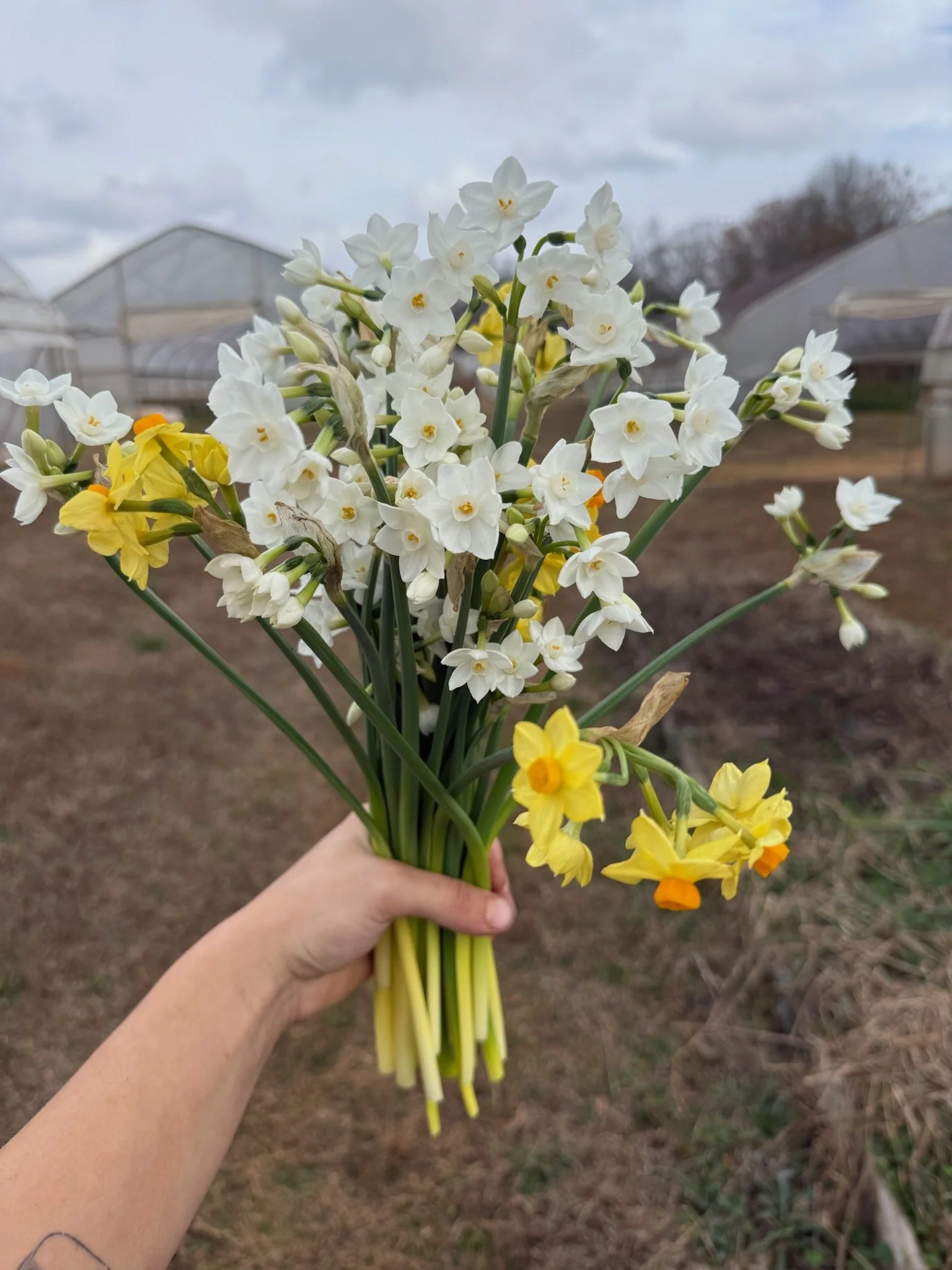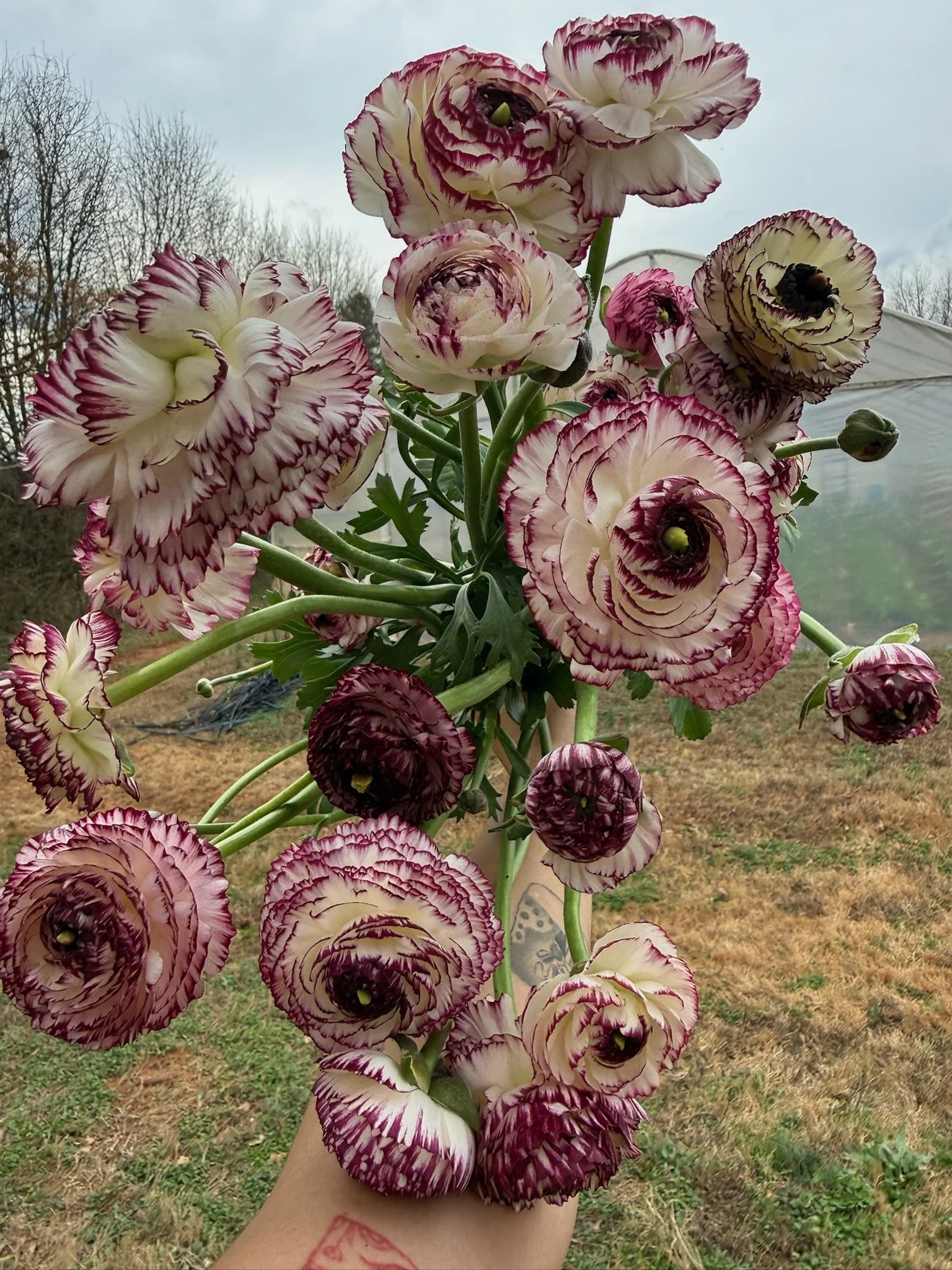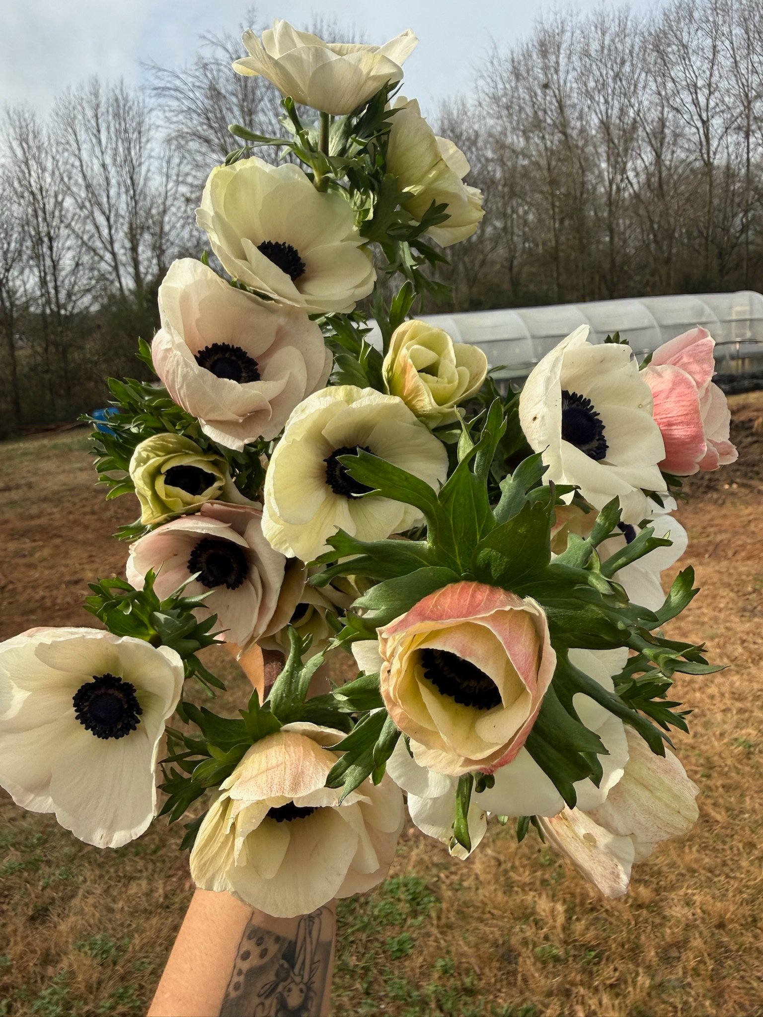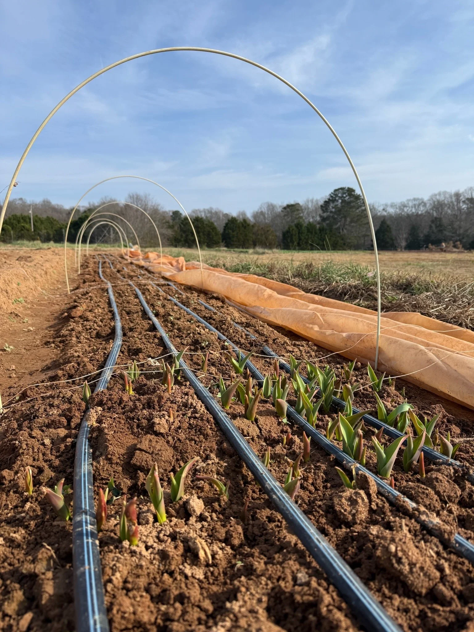 Is spring early? Is winter late? These are the questions we are asking ourselves as our ranunculus, anemones, and poppies begin to put out more and more blooms and our tulips peek their heads out of the soil. Perhaps La Niña graced the Southeast with a mild winter, perhaps the winter is saving up its wrath for February and March, perhaps it’s some other mystery we will never be privy to. But even barely having seen winter, all the signs of spring are here, complete with a spring cleaning blitz at the farm. Last week Farmer Alex and Farmer Casey re-organized our outdoor tool shed/farmer kitchen area and we are LOVING the new setup. Farmer Emma took it a step beyond and scrubbed the exterior of our veggie walk-in free of years of algae and grime and it’s looking so clean that we need to wear sunglasses to make direct eye contact with it.