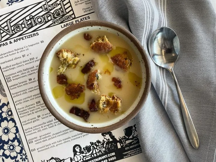How about some good news! Here in Athens we have so many restaurants that we adore who take our produce and turn it all into all sorts of incredible dishes. The National recently came out with two new menu items centered around a few of our spring favorites. The first features our green garlic - a Roasted Garlic Soup with bacon lardons, green garlic oil & croutons (easily available vegan and gluten free!) With the weather taking a dip, a cozy flavorful soup sure sounds good.