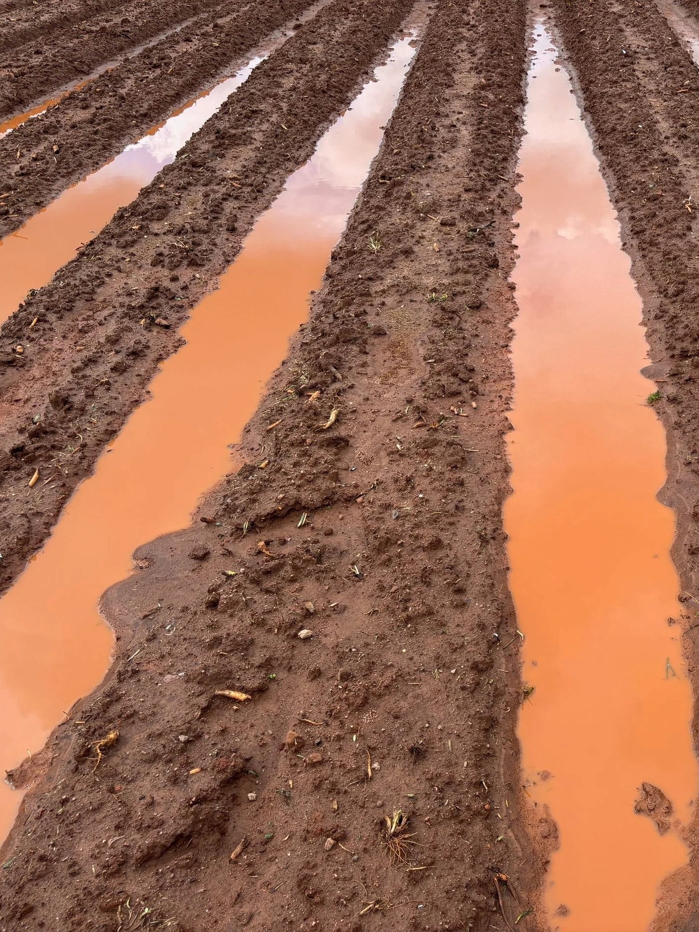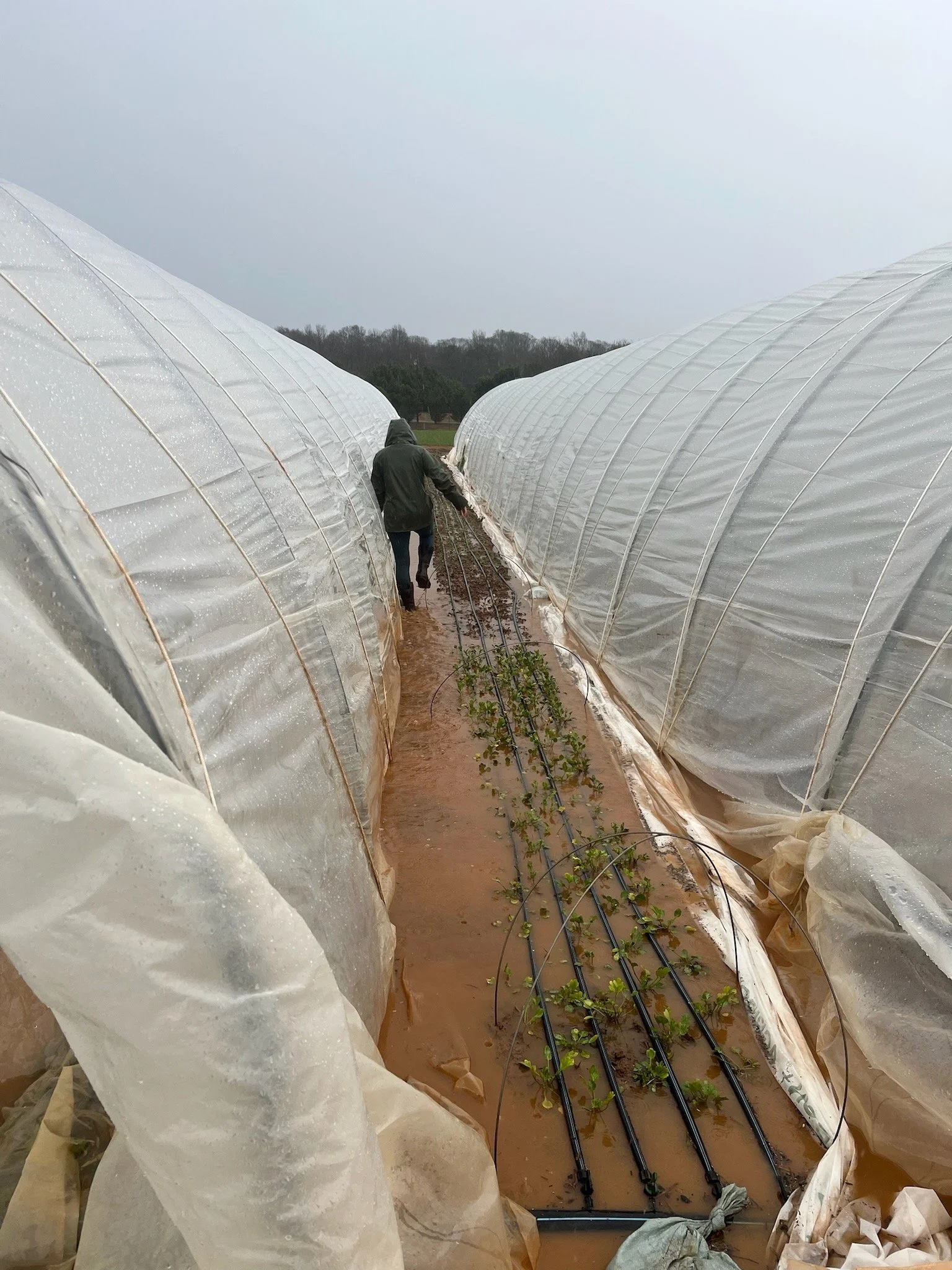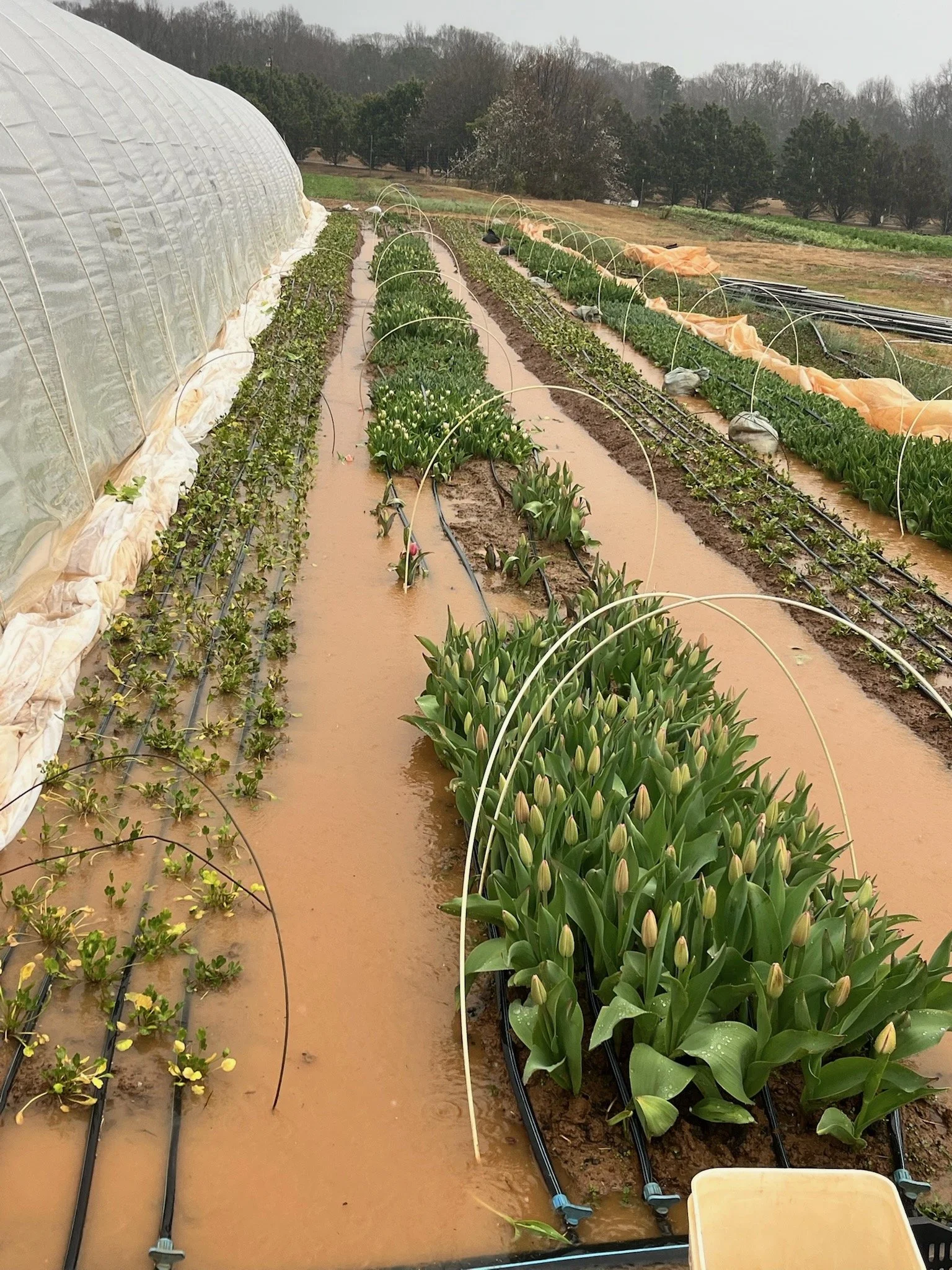 We are revising “April Showers bring May Flowers” to “February Showers bring March Flowers and also Flooded Fields.” I mean holy moly 3.5 inches of rain in two days last week! Respectfully, What the hell! Drainage is something we are constantly working on in our fields. Managing where the water goes when it rains is hugely important to the health of our plants because when the sky dumps that much water on our fields, it’s a challenge for our crops. A plant sitting in a puddle of water is a plant getting no oxygen to its roots, and a plant getting no oxygen to its roots is a plant slowwwwly suffocating. Beyond that, if enough time passes with wet wet feet, the roots will begin to rot and that means so long for this lifetime.