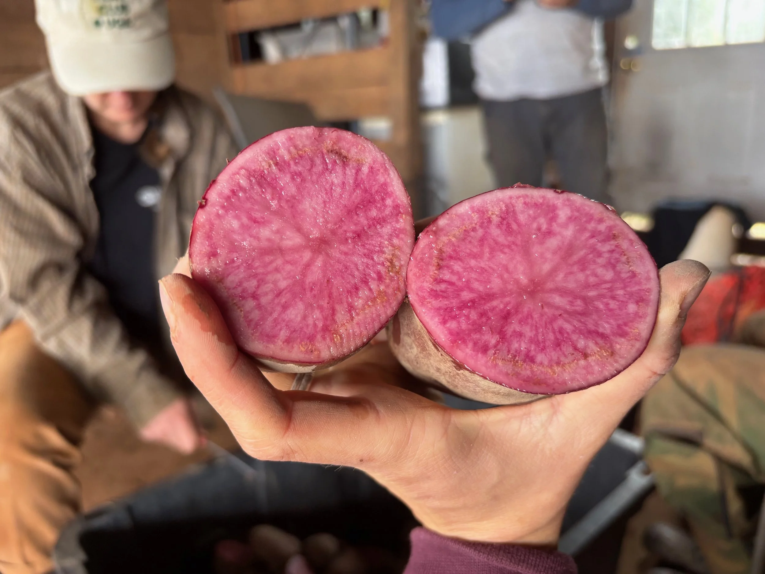 A sit-down group task is always a hoot as we pass the time with our hands busy at work. With the task at hand feeling endless, we debated over if the word should be “Sisyphean” or “Sisyphusian” to describe how we feel like the greek king doomed to roll a…. potato…. up the hill and down again for eternity (its the former). But eventually the task was completed, and we got to see a preview of the BEAUTIFUL potatoes we’ll be growing this season. Check out this Terra Rosa variety: