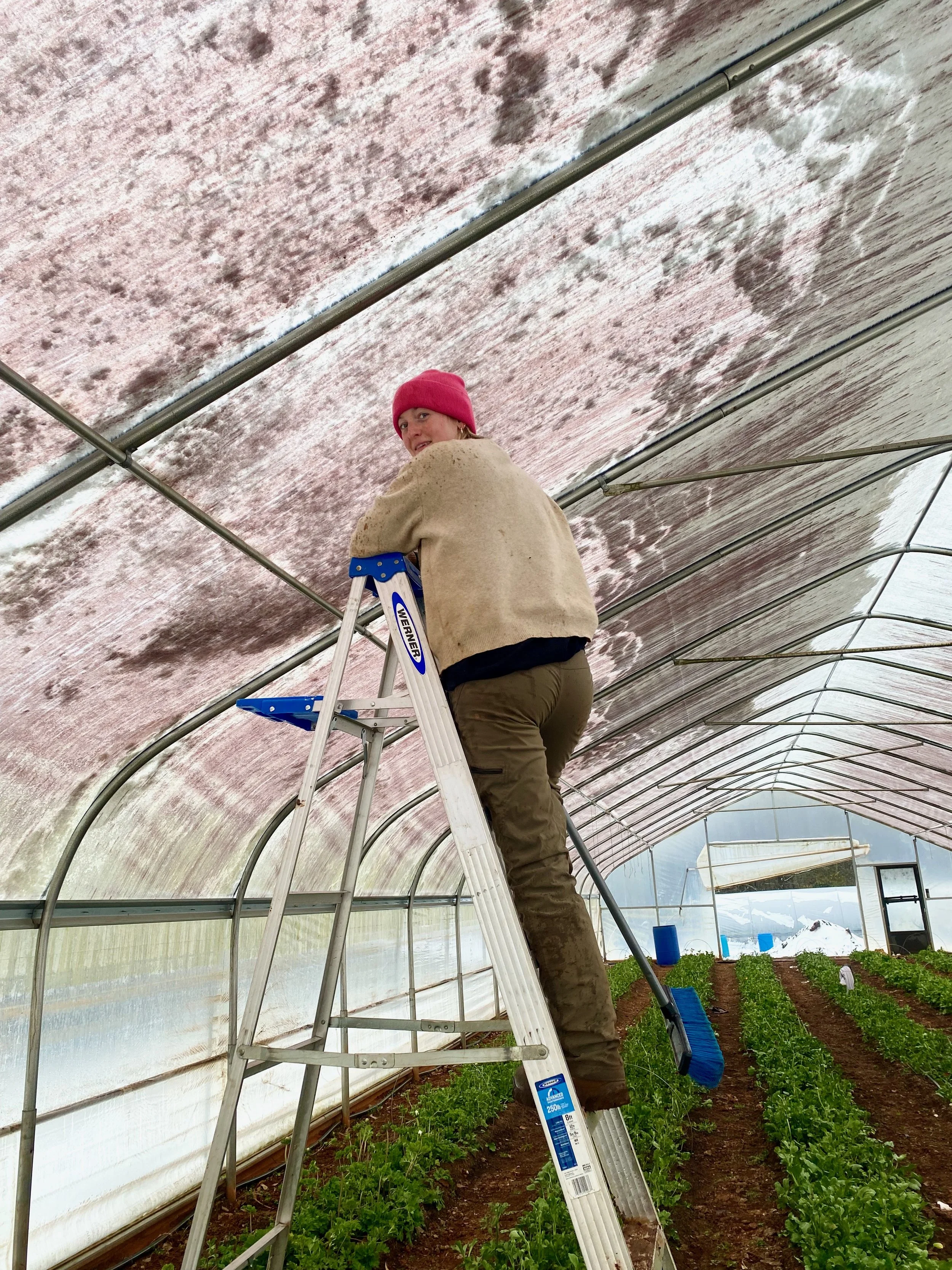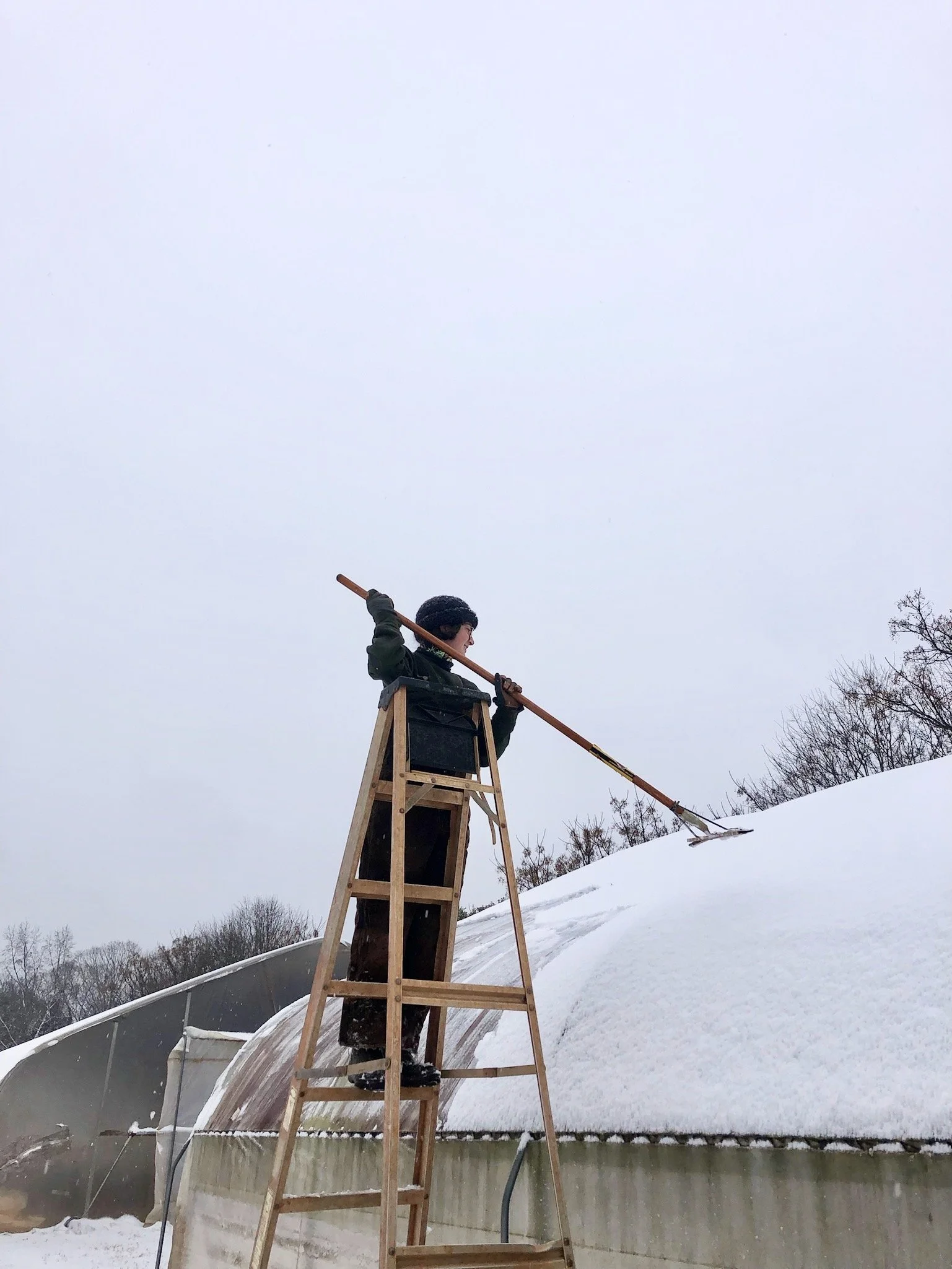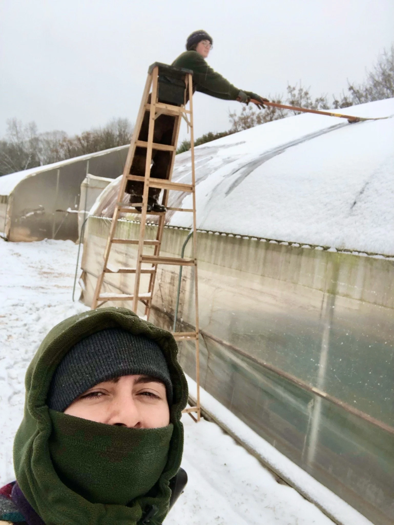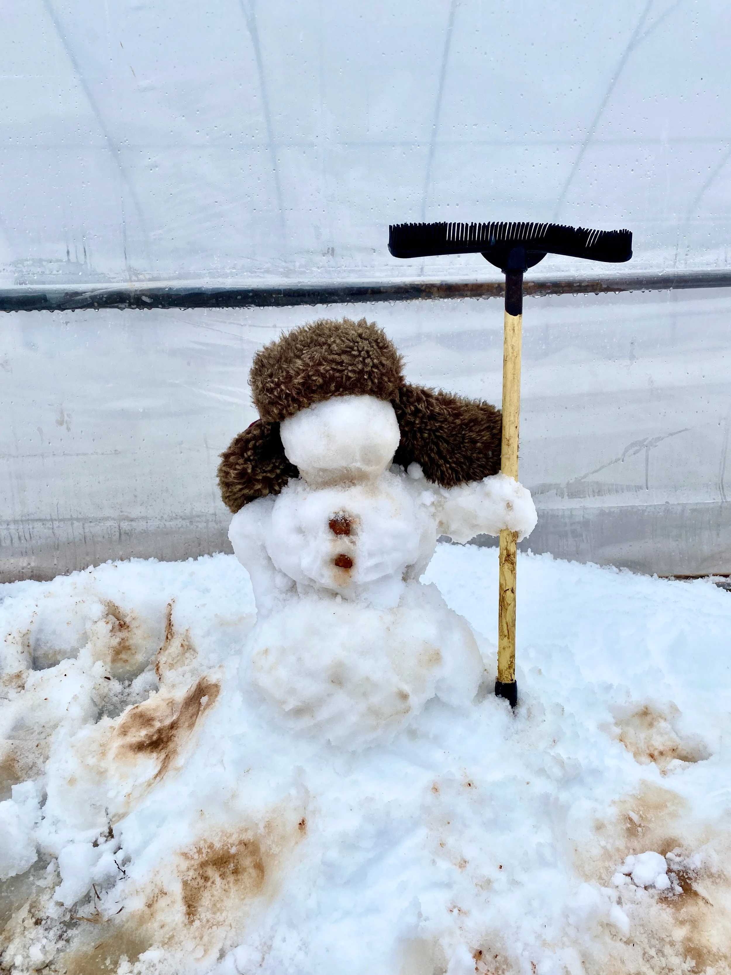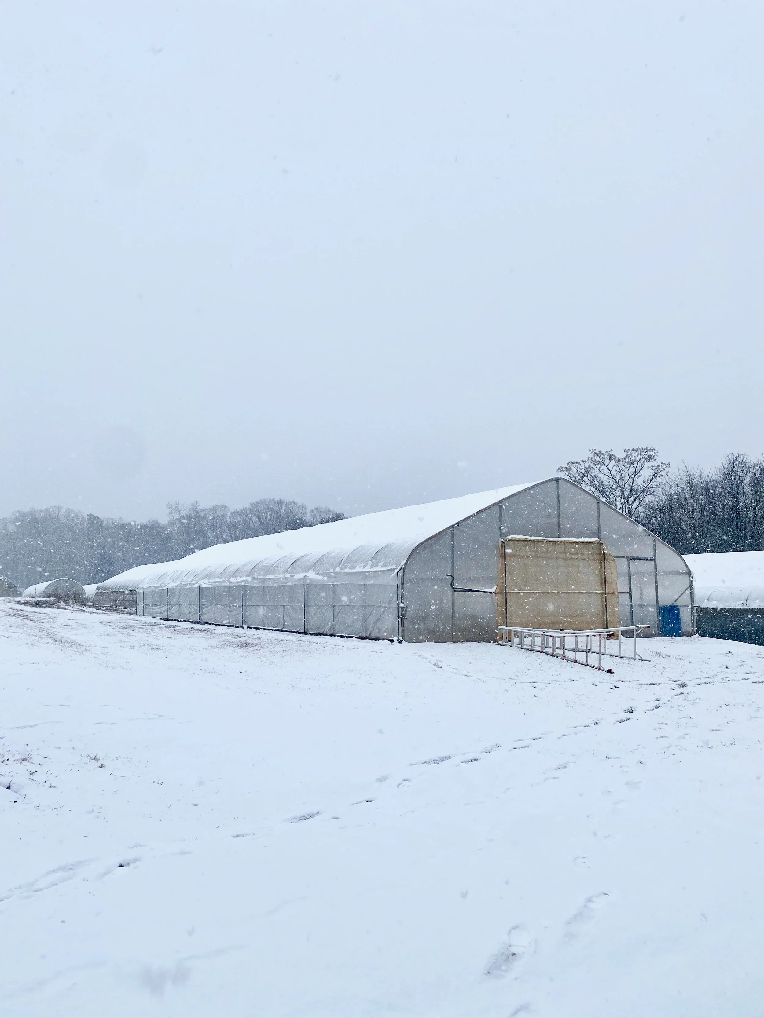 What very regular and not at all unusual weather we are having!!!! This past Friday (like any other Friday) was spent pushing snow off of our greenhouses in our best effort to save our infrastructure. A handful of our farmers braved the elements during Winter Storm Cora and made their way out to the farm in the midst of the morning snow. Living in the south we don’t typically plan for things like snow, and as such our infrastructure isn’t built to deal with more extreme wintry conditions. The greenhouses on our properties are not rated for snow, so we had concerns about them potentially collapsing if the weight of the snow became too heavy. We weren’t too far off in our fears, either. As we began to figure out the best methods to remove snowfall from the tops of our high tunnels, the center bar of the house we were in started to become misshapen due to the load on it - that certainly lit a fire under us to work quickly! Over the course of the day we experienced what is probably the most intense upper body workout routine known to man (“my neck, my back….” was certainly thrown around frequently). Using push brooms and squeegees we bopped the snow off from the underside of the greenhouse plastic. Over and over and over and over. If you remember Farmer Emma’s interview though, you’ll remember one point she made that rang true - some of the most fun we have is in the midst of weather-inflicted suffering. Four and a half hours of smacking snow from below, a couple broken brooms, many cold wet fingers, and one snowman later and we managed to clear the snow with only minor damage. Check out our instagram post from Friday for more of our snowy escapades!