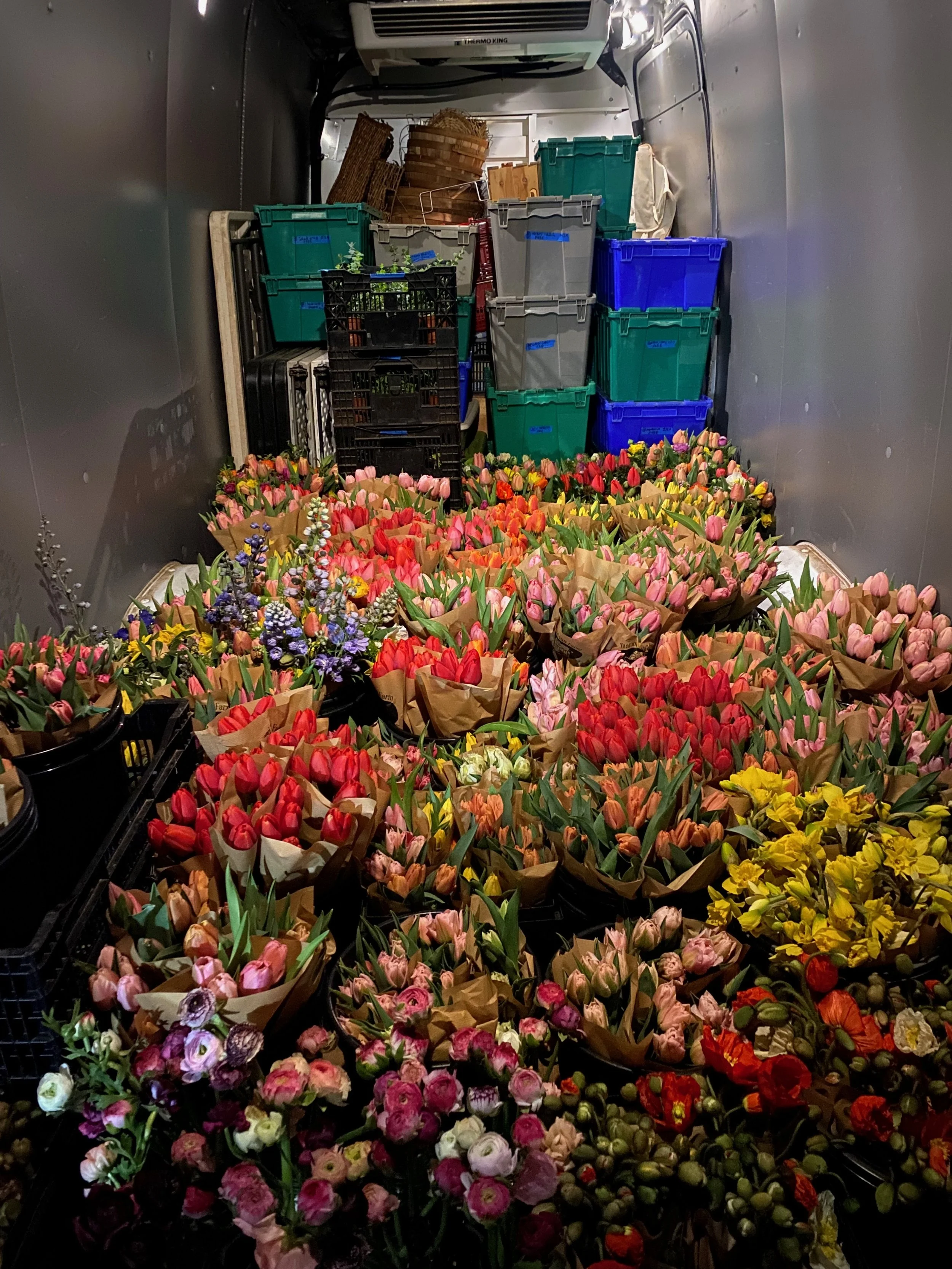Lately on the farm we’ve been deep in tulip-land! These suckers are blooming just as fast as we can keep up with, and last week was our first HUGE harvest marathon. Back in November we planted over 30,000 bulbs and we’re beginning to understand the “consequences of our actions,” so to speak. The flower crew is already starting to pick their favorites of the year, with Sanne, Apeldoorn, Columbus, and White Valley as early farmer faves. In the coming weeks you can expect lots of gorgeous tulips in your CSA bouquets!