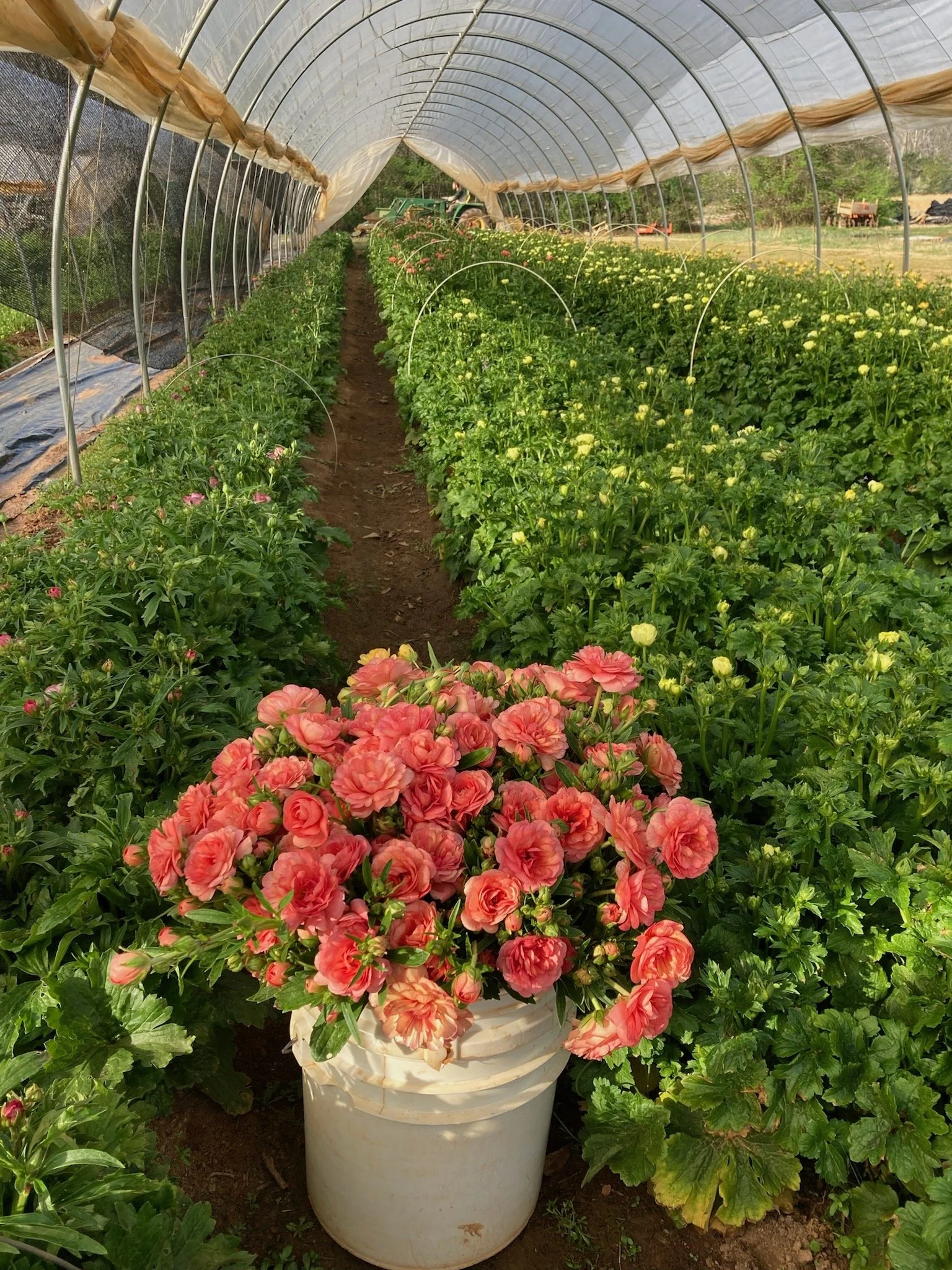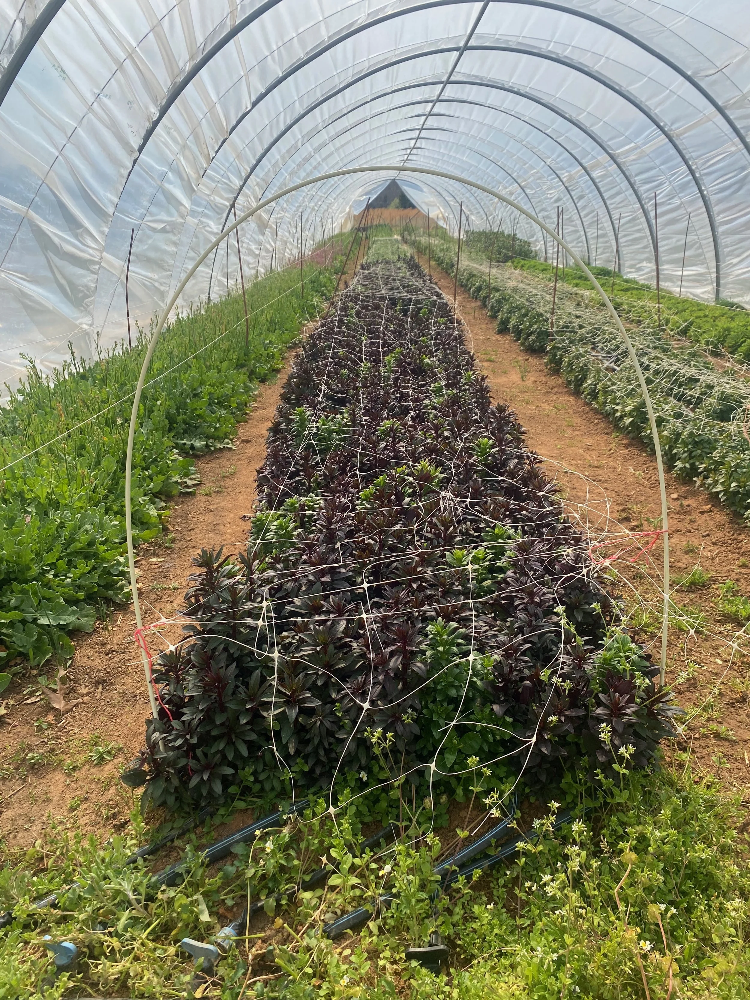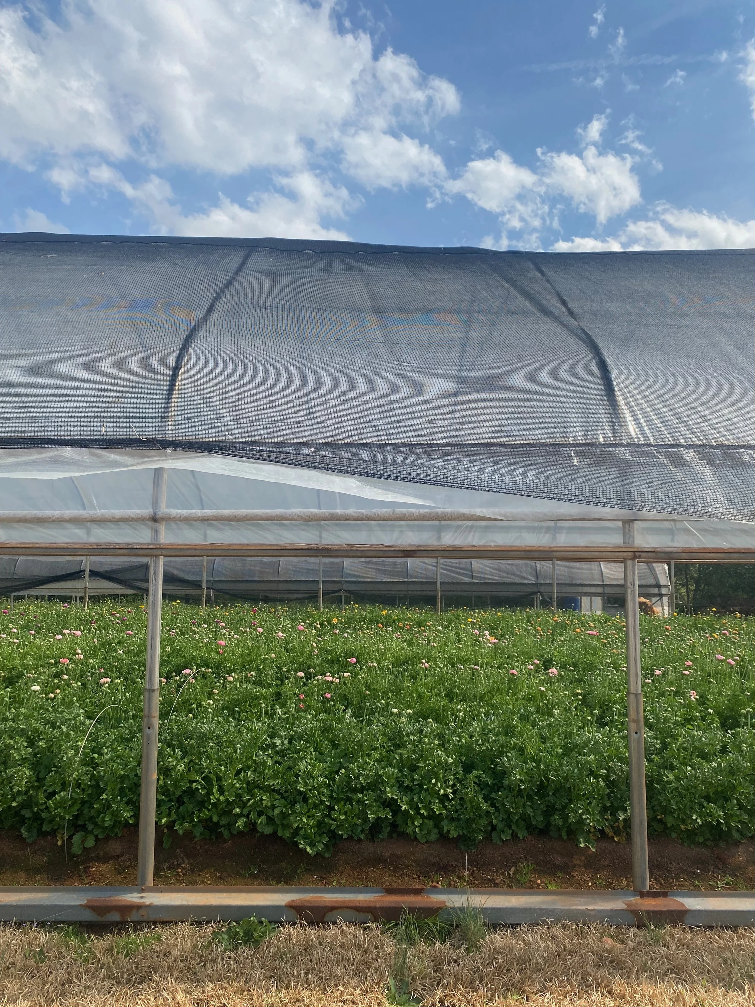 Let’s continue our farm walk over to the flower high tunnels where we just added some shade cloths. Shading our flowers encourages them to stretch upwards for those long stems! There are so many blooms right now - ranunculus, poppy, and anemone all producing like crazy and looking very happy. Hortonova netting has recently been placed over top some of our flower plantings, like our snapdragons, on the north side of the farm. As they grow upwards and through the netting, it will help support their stems as they grow taller and taller, ensuring they don’t fall over.