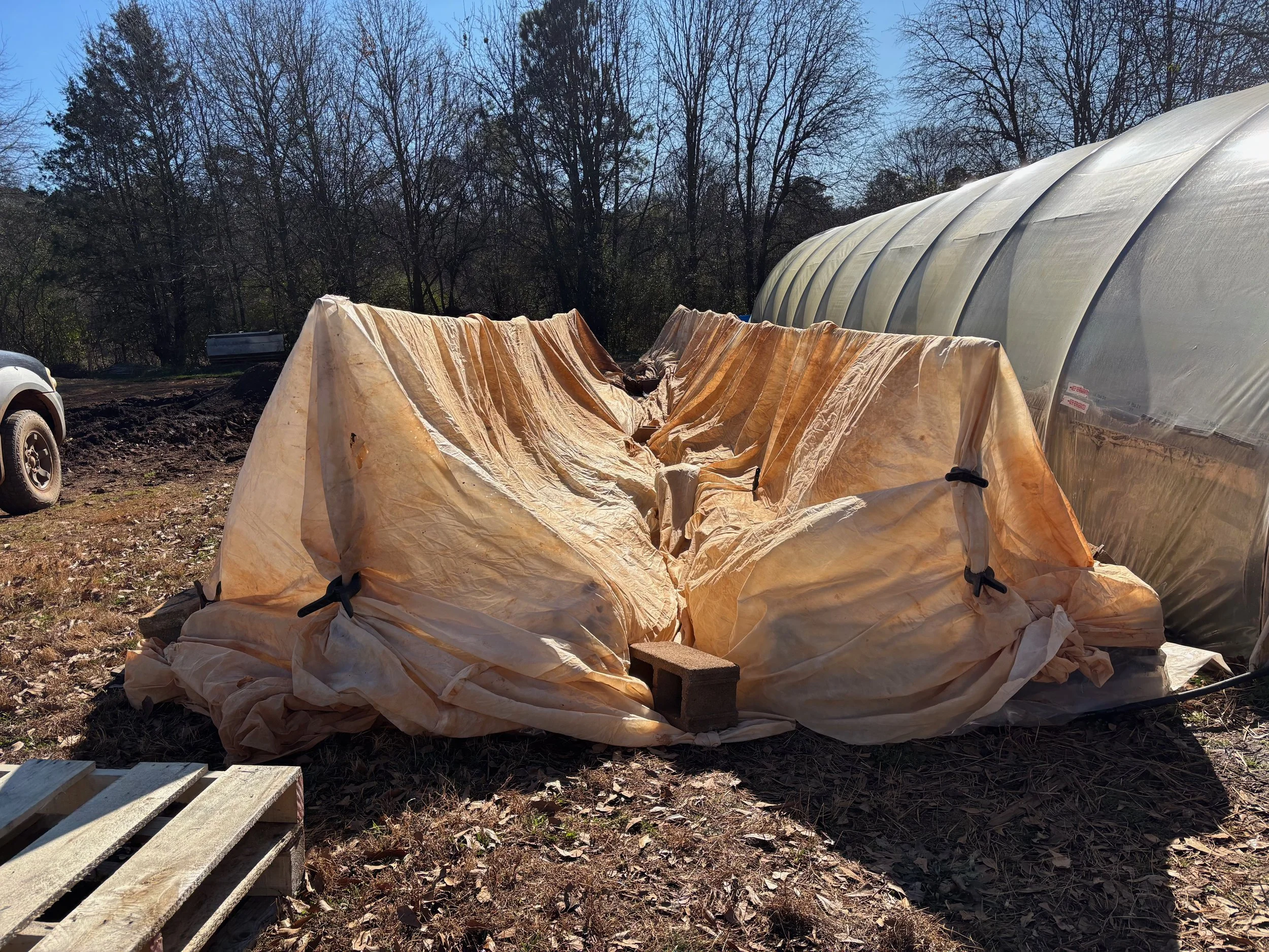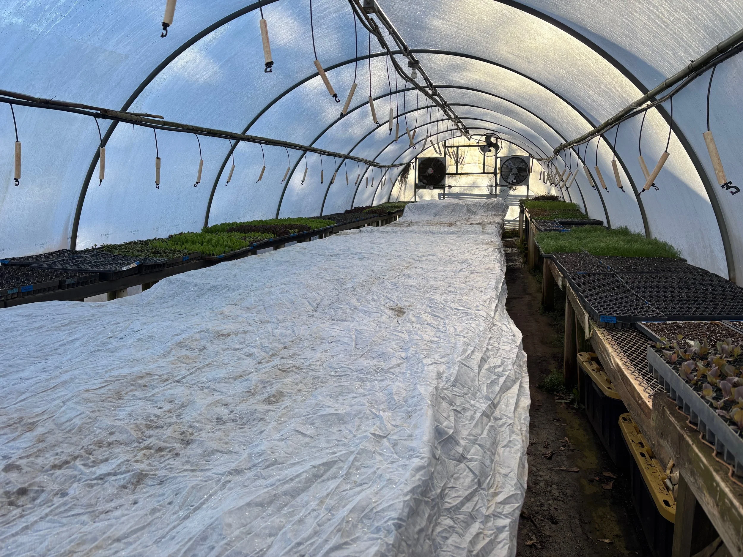 Okay okay okay we take back everything we said last week about winter not coming this year. It’s here and we are saying “uncle!” BRRRR!! We had a chilly week & weekend, and much of our time was spent prepping for lows in the low 20’s. Every time it dips this low we’re reminded of how bizarre it looks to have the farm buttoned up so tight. Every high tunnel closed with each bed under row cover inside, every outdoor crop with hopes of survival covered with sheets of white frost cloth. If you walked on the farm during an afternoon like this, there’s not a plant in sight. We even took precautions to protect our germinating trays of tomato seeds.
