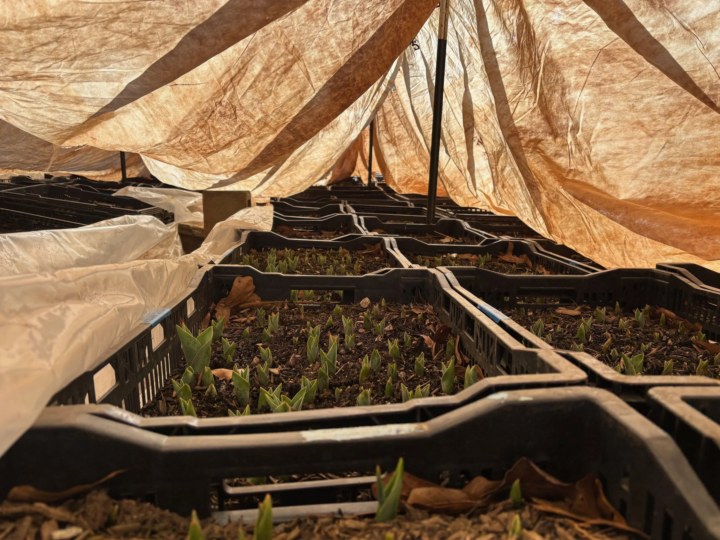 Our crate tulips transformed into two tents for some very tall campers. Old frost cloth draped over the irrigation system and scraps of greenhouse plastic wrapped around the crates will keep them from frost damage. No such thing as waste, just untapped resources! Our thrifty solution is keeping these tulips warm enough, but I still wouldn’t trade places with them!