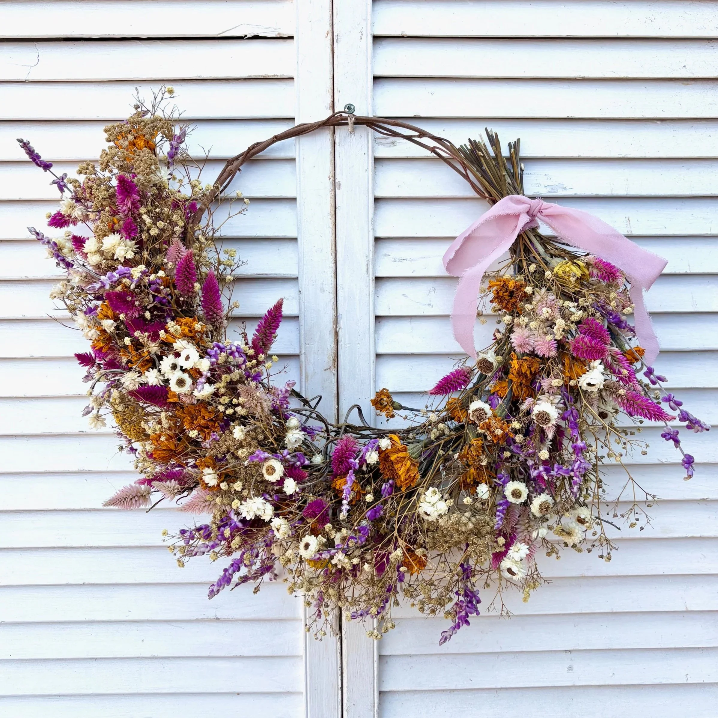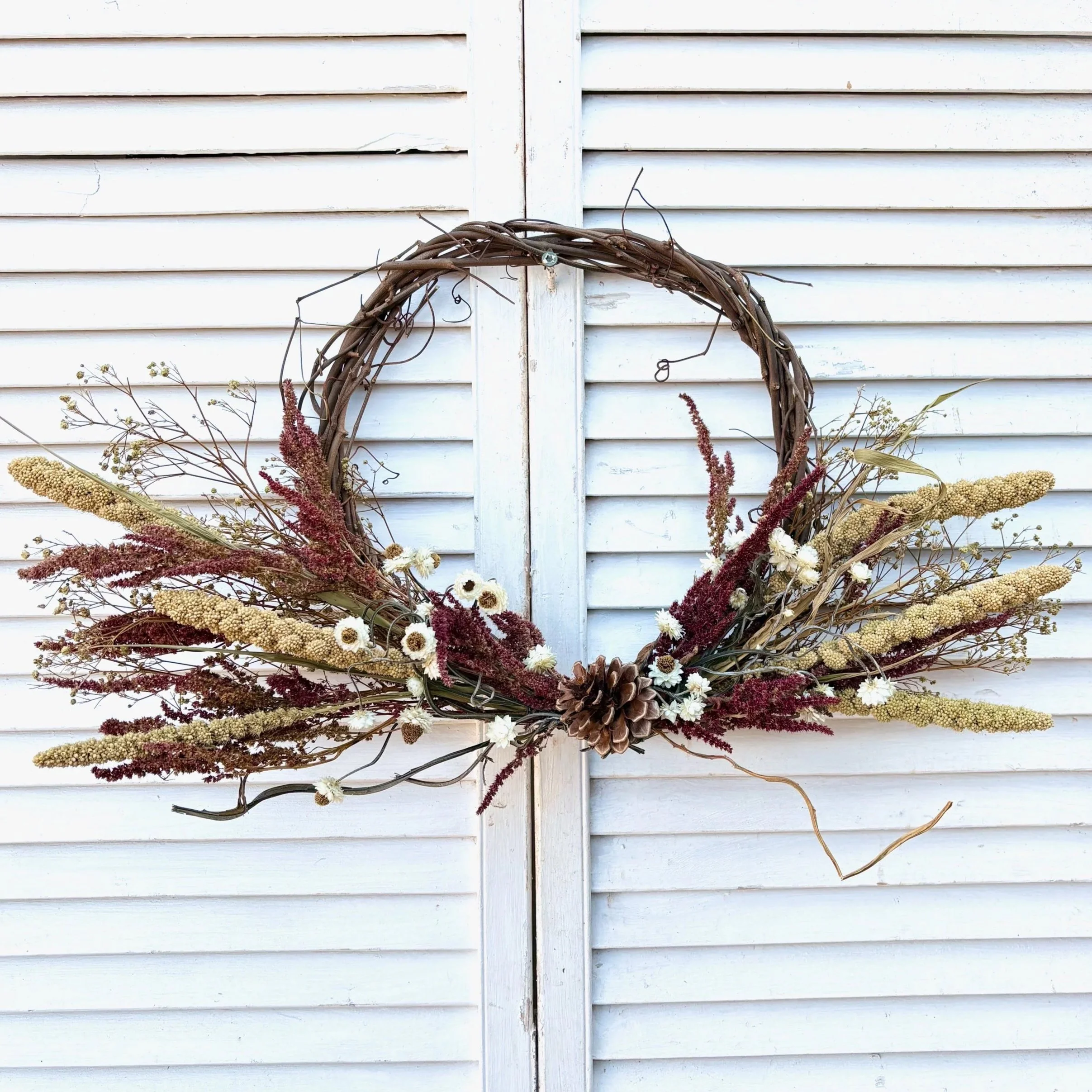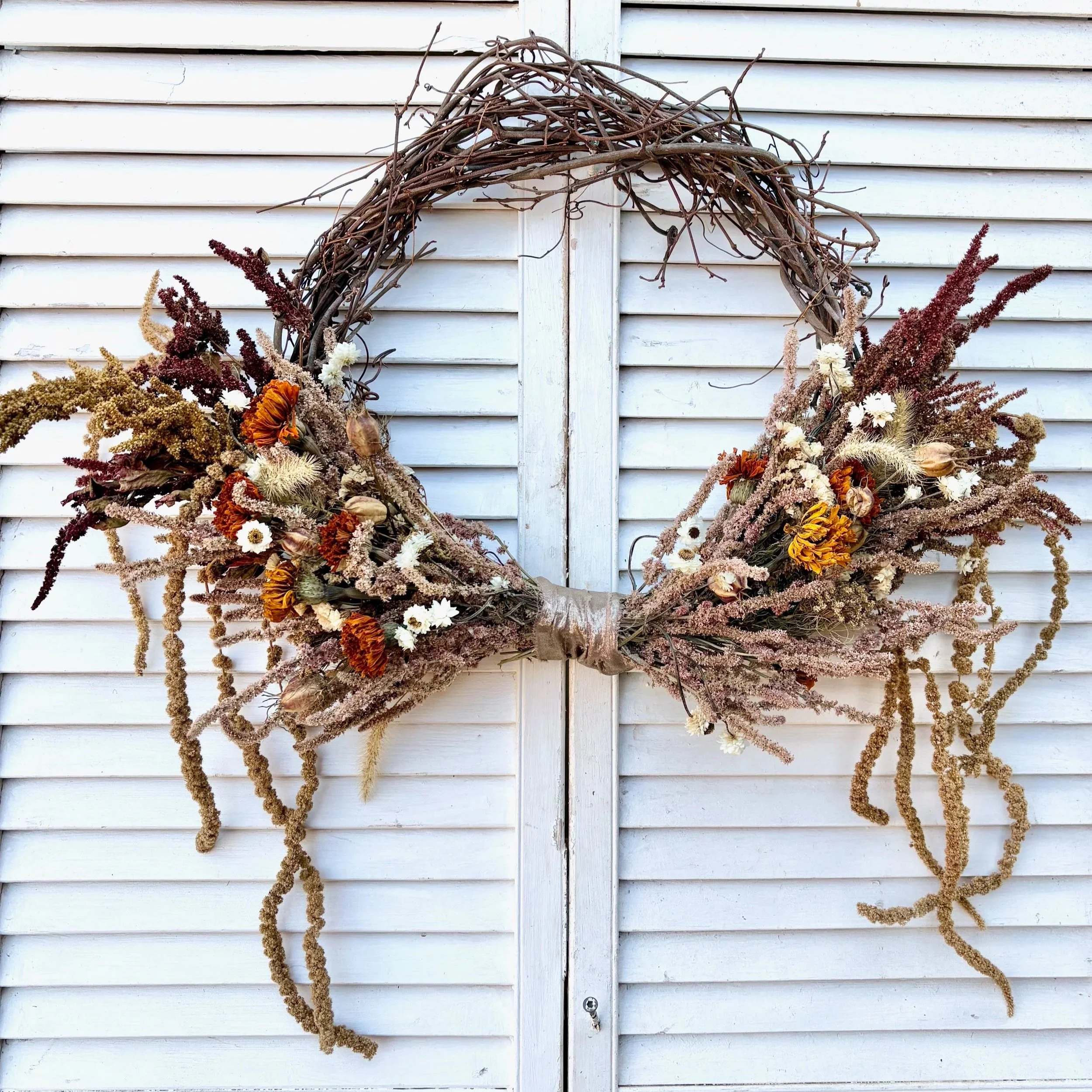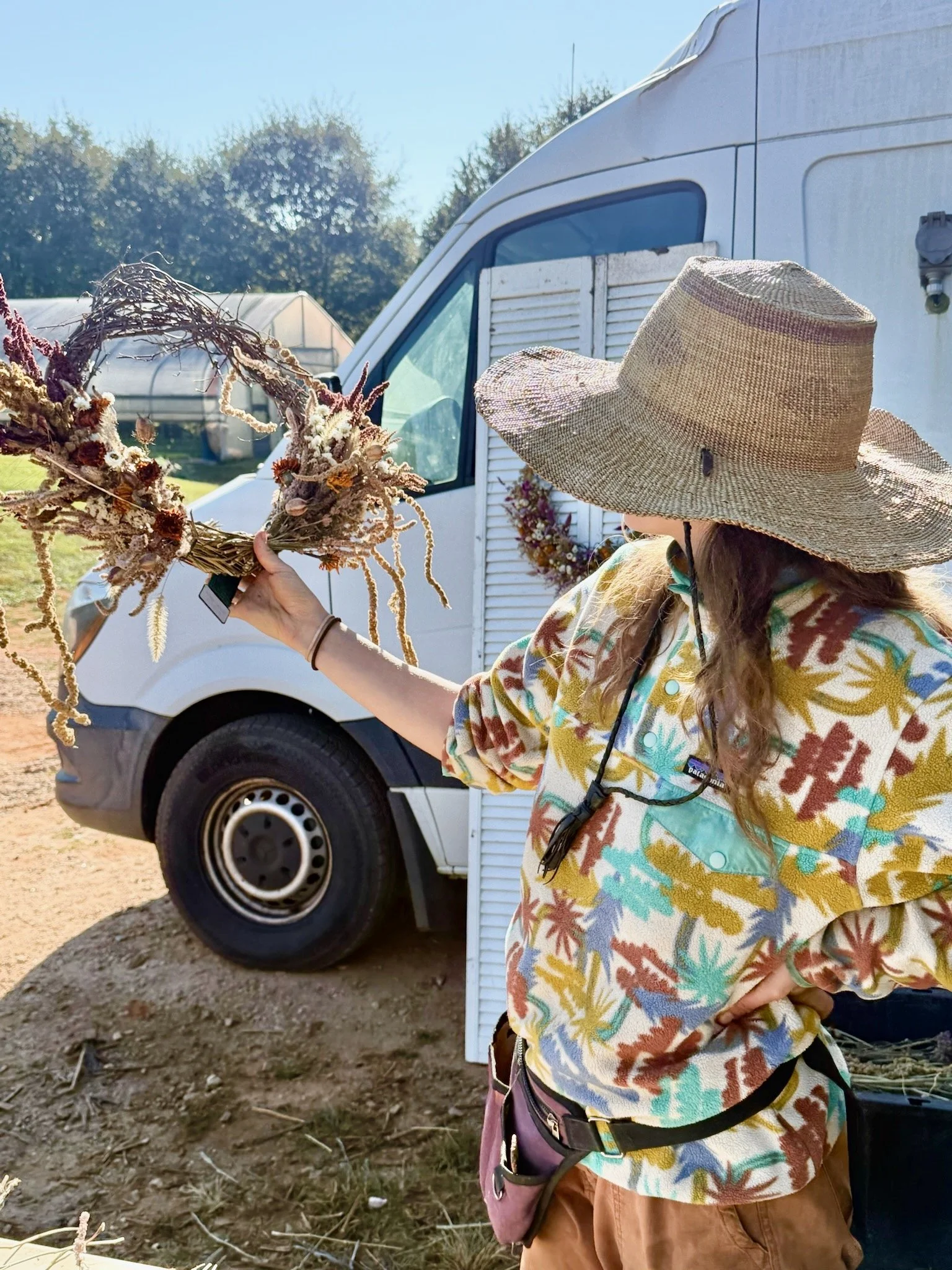 Another sure sign of fall is that wreath-making is in full swing at the farm. All year long we set aside flowers to dry in our tractor barn, and once we feel that hint of chill in the air we begin putting together these floral creations. Farmer Morgan and Farmer Caro are the wreath masters this year, and you can get your hands on some of these beauties at our farmers markets! We’ll be making more every week for about the rest of the year, so long as our supplies allow, so keep your eyes peeled for one that strikes your fancy! These wreaths are made to last for years, with a little care. Just keep them out of direct sunlight, away from moisture (dried flowers and moisture don’t mix!), and somewhere they won’t get bumped around. Some of us still have wreaths from seasons past that look as lovely as ever. Check out some of what we made last week!