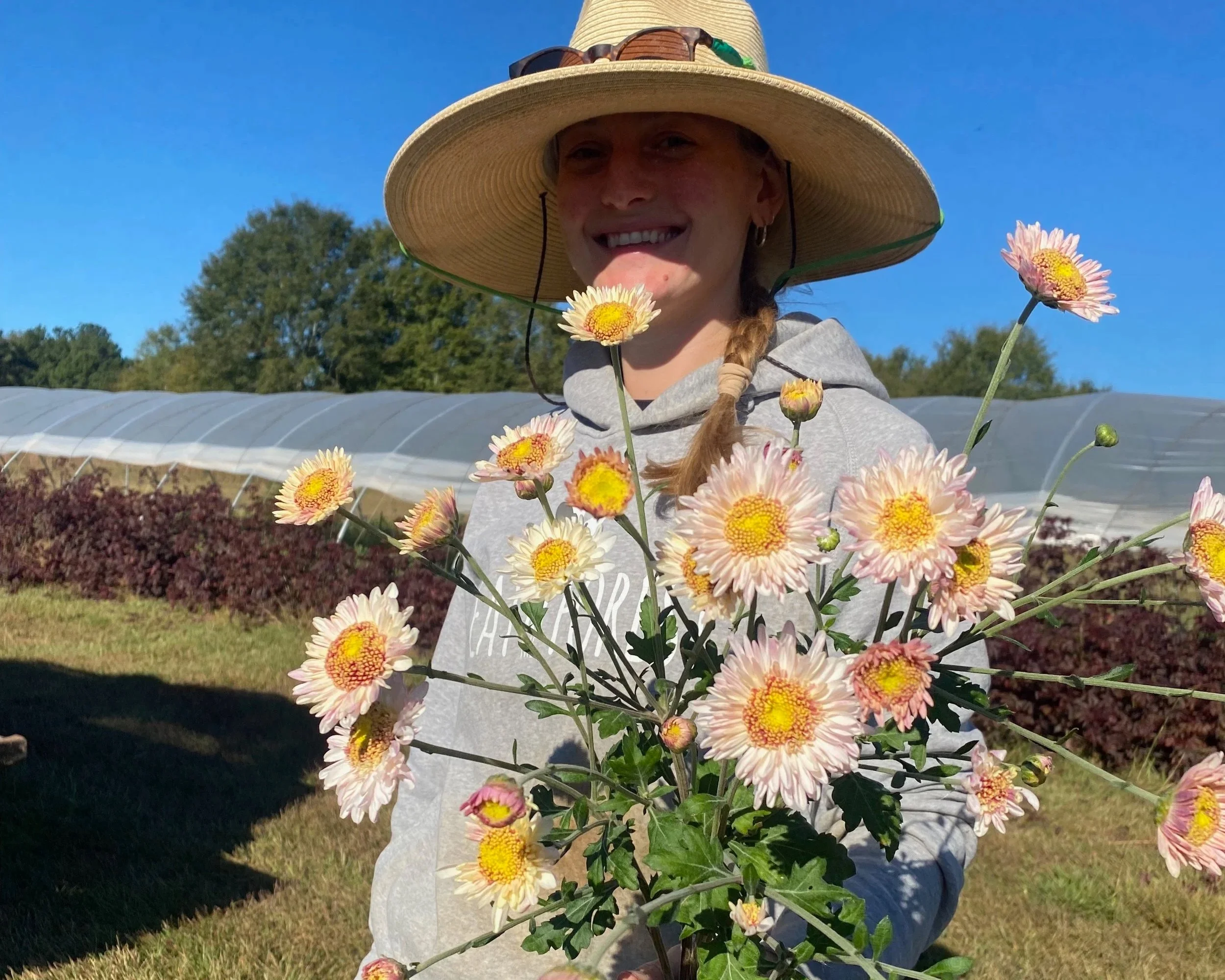 Typically we expect mid-October to start bringing frosty evenings, which in turn kills off most of our field-grown flowers. However, this year the frost looks to be arriving late. We’re excited to still be harvesting dahlias, cosmos, marigolds, zinnias, and more out of our fields. But even with frost on the horizon, Flower Land has one more big push for the year…. mums! We’re starting to see early blooms on some of our most anticipated heirloom varieties in the mum houses, which means get ready to hold onto your sunhats!! We’re about to be in a whirlwind of colors and that incredible chrysanthemum smell.