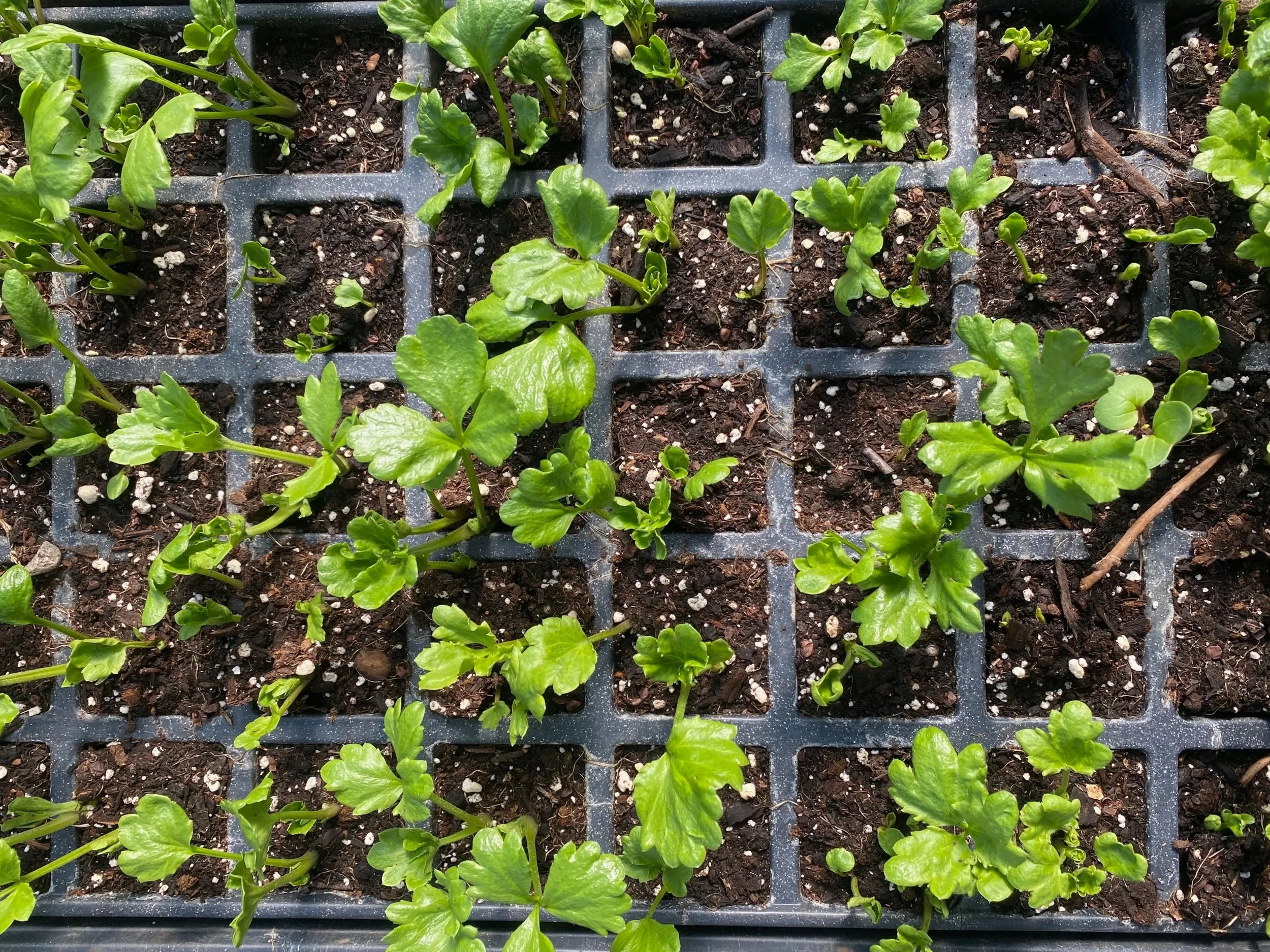 Back at the farm, our anemone and ranunculus corms have sprouted and have been removed from the cooler. After their cooler-induced jump-start, they are now thriving in their starter trays outdoors, getting their roots developed and leafing out, growing big and strong before we plant them.